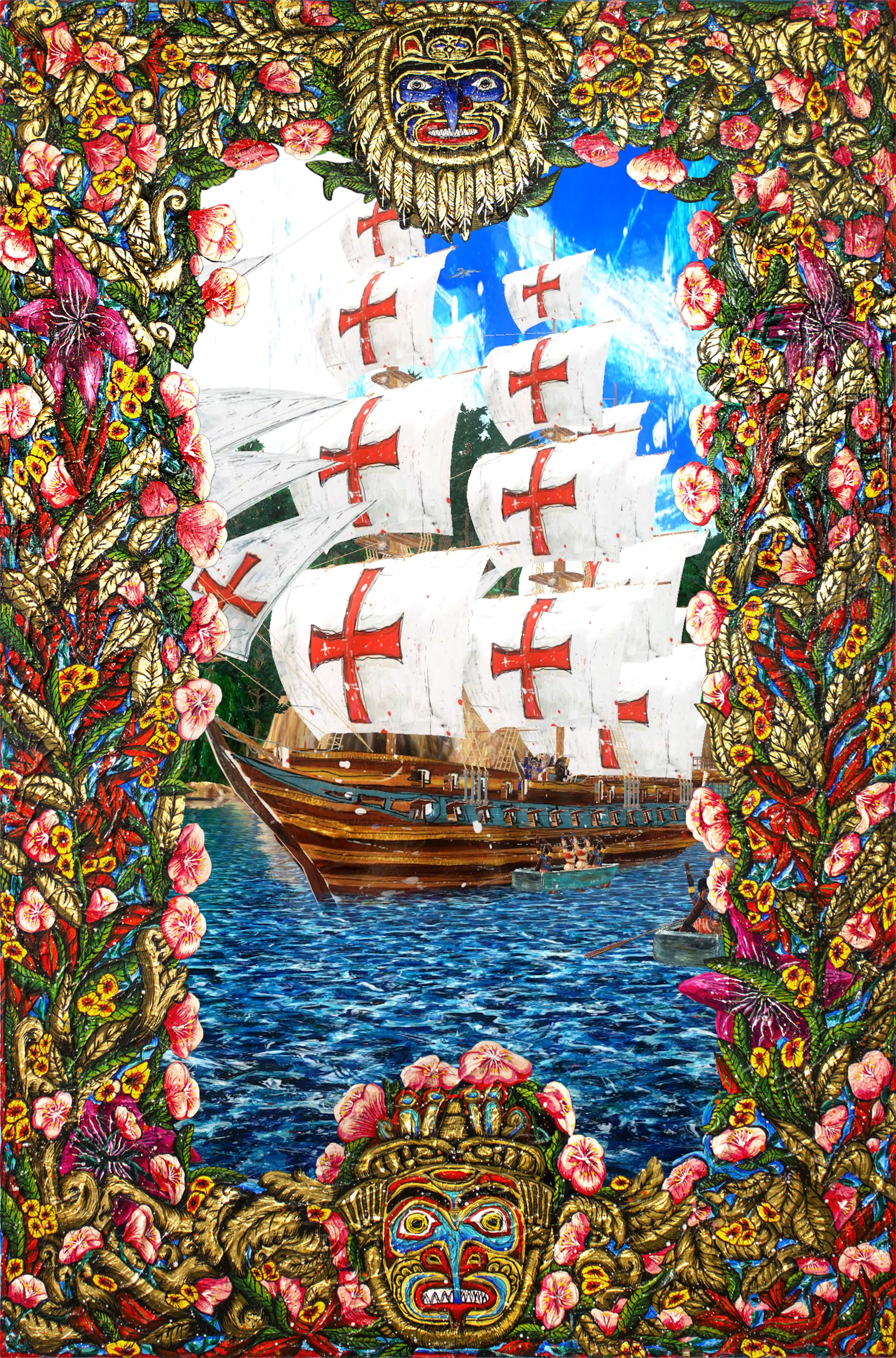 The Gracious Conquistadors, 2016 Acrylic, gold leaf and silver leaf on plexiglass, LED screen, video loop (2min: 26 sec) 86,36 x 132,08 x 10,16 cm