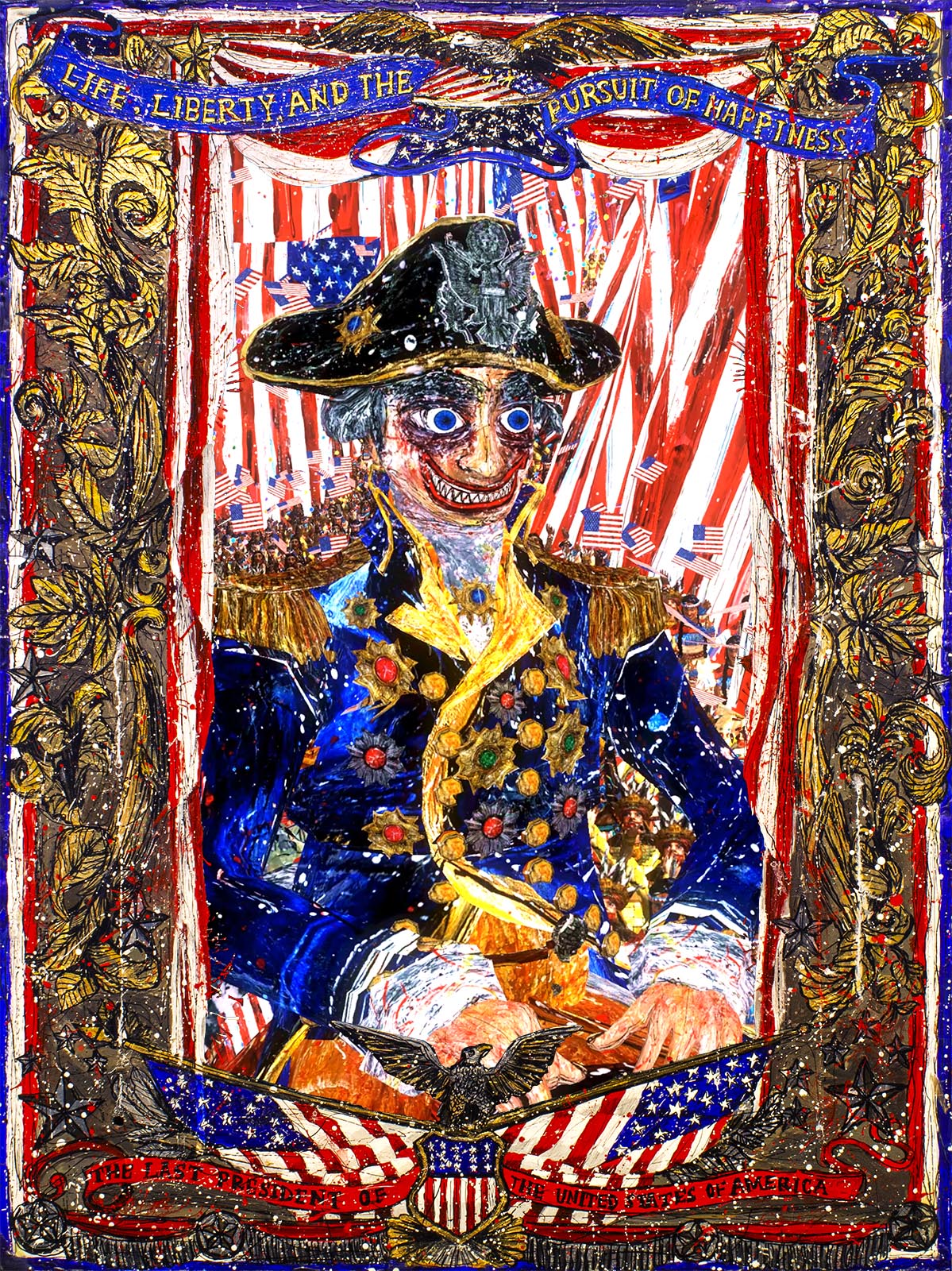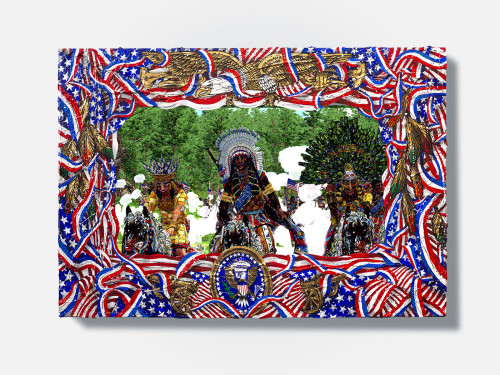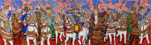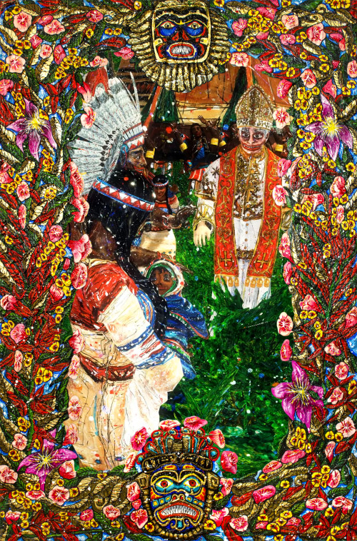 The Great Debauchery 2019 Acrylic, gold leaf, silver leaf, felt tip and ink, mixed media on wood panels with relief 182,88 x 609,6 x 7,62 cm