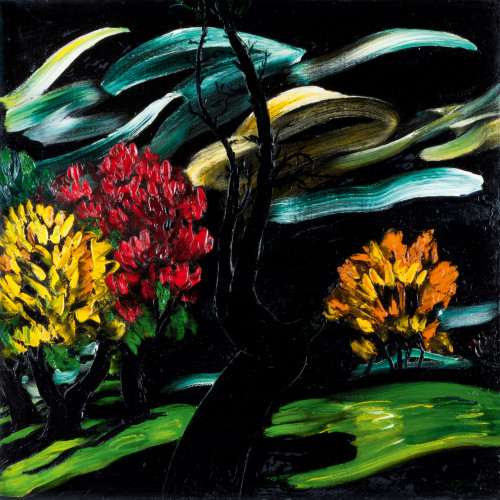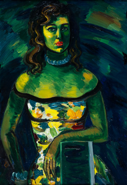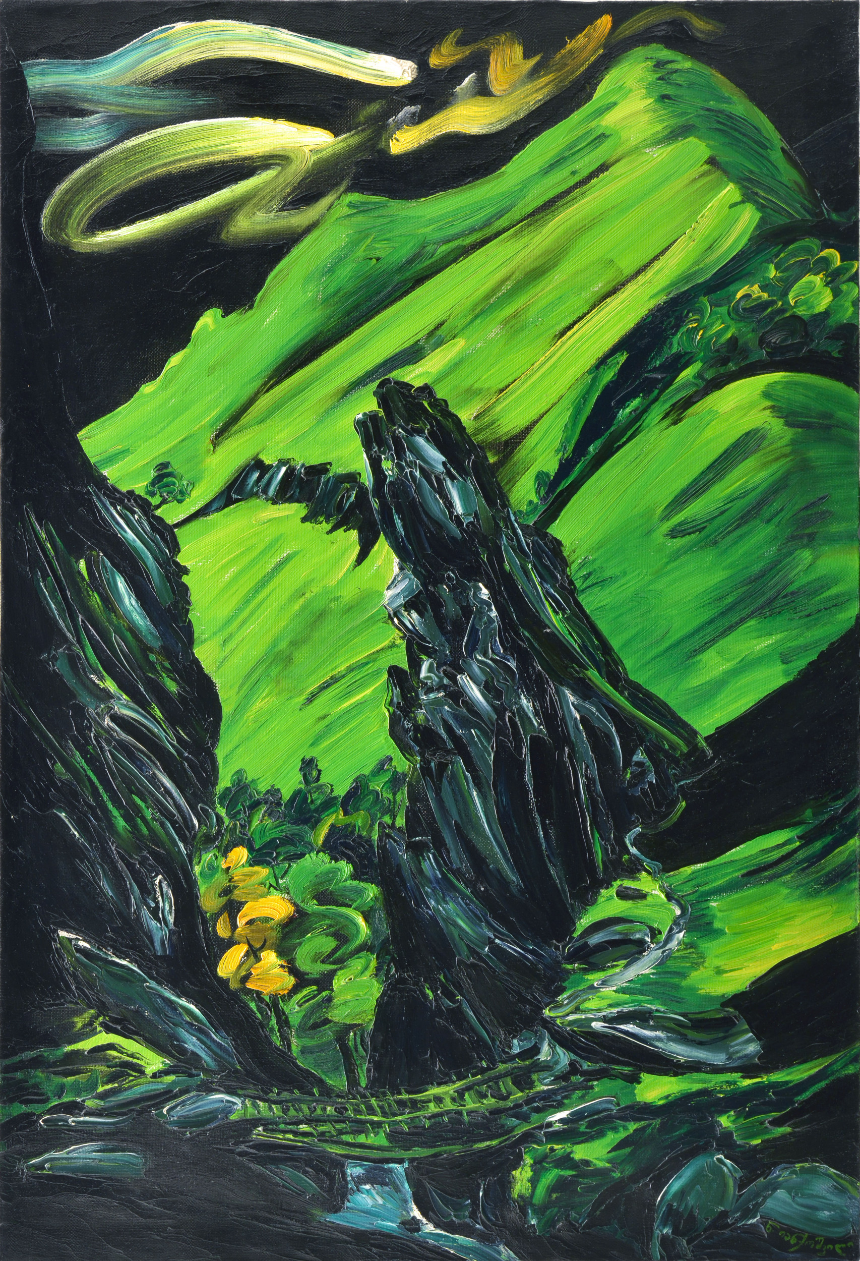 Natela Iankoshvili was an iconic artist in her home country of Georgia. Her recognizable style is known for its dark blacks, greens and gleaming moments of light erupting out of a field of darkness. She travelled throughout Europe, Cuba and Mexico, recording her travels in art. However, Iankoshvili is best known for her Expressionist paintings of figures and views of Georgia, which have been exhibited worldwide.