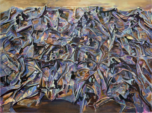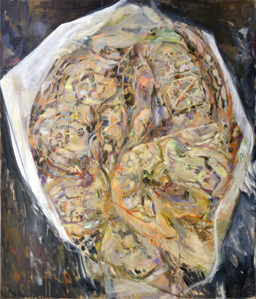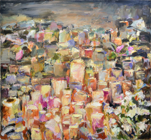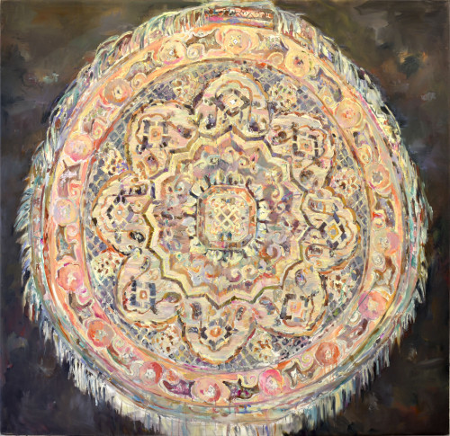 In Franziska Klotz’s work, reflections on the self and the other lead to an exploration of images from her own family history. “Heimat” and “Heimat 2”, one of which was created while the artist was still living in Berlin, the other shortly after her arrival in Istanbul, are based on a theme, which for the artist is connected to a multiplicity of personal memories. The fabric’s Orientalizing ornaments seem like an anticipation of what might lie in store for her in the foreign country. Her study of Ottoman art, which neglects illustrative figuration in favour of the ornament, enabled Franziska Klotz to tell the stories of the images that underlie her paintings by the mere use of colour and form: a focus on textures, a rejection of the compositional structures of Western painting and an image build-up that largely relinquishes any spatial-illusory depth effect.