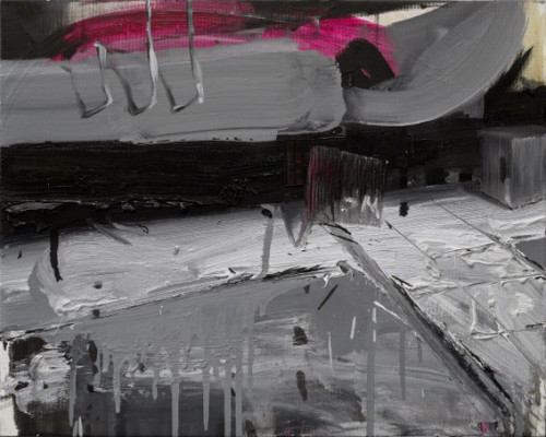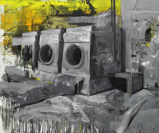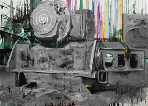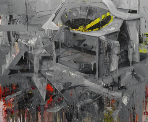 The figurative paintings by Leonardo Silaghi unite seemingly unfinished, gestural-expressive sections with elaborately detailed areas. Heavy gray machines are placed within the picture in a unique way. Colored accents appear in contrast to a broad pallet of different gray tones.