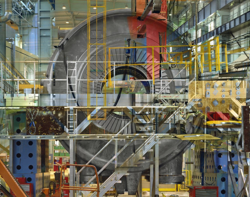 The large-scale photographs by the contemporary photographer Stéphane Couturier are never committed to representing the purely factual. They also create a new, image-immanent order of things: Through the superposition of two different images of the same place, the artist creates intensely colored to almost abstract works. His works, which have more in common with the definition of contemporary painting as color, line and surface than with traditional notions of photography as a document, are characterized by dynamic verticals and horizontals, elegantly curving lines and brilliant effects of light and color.