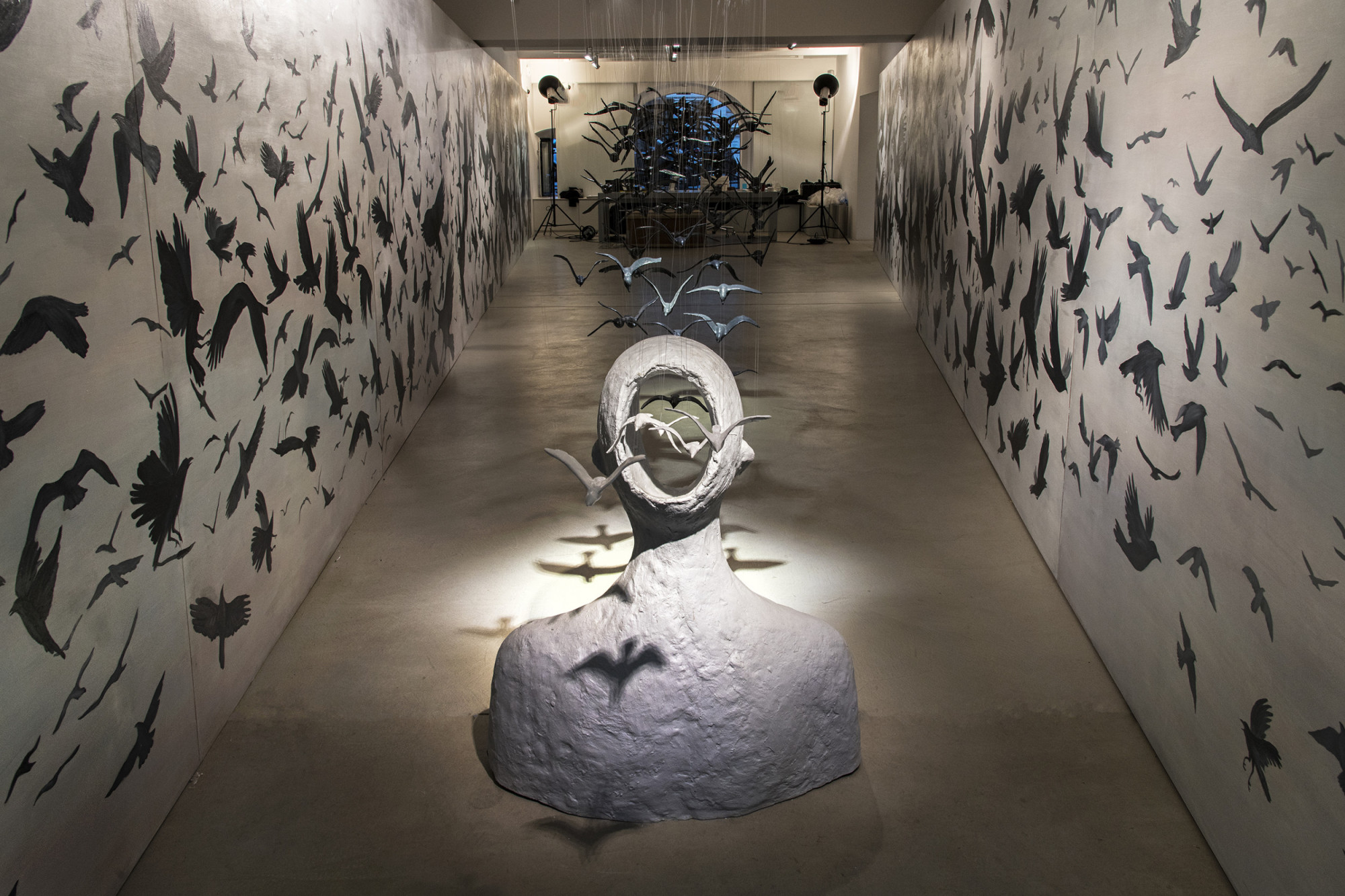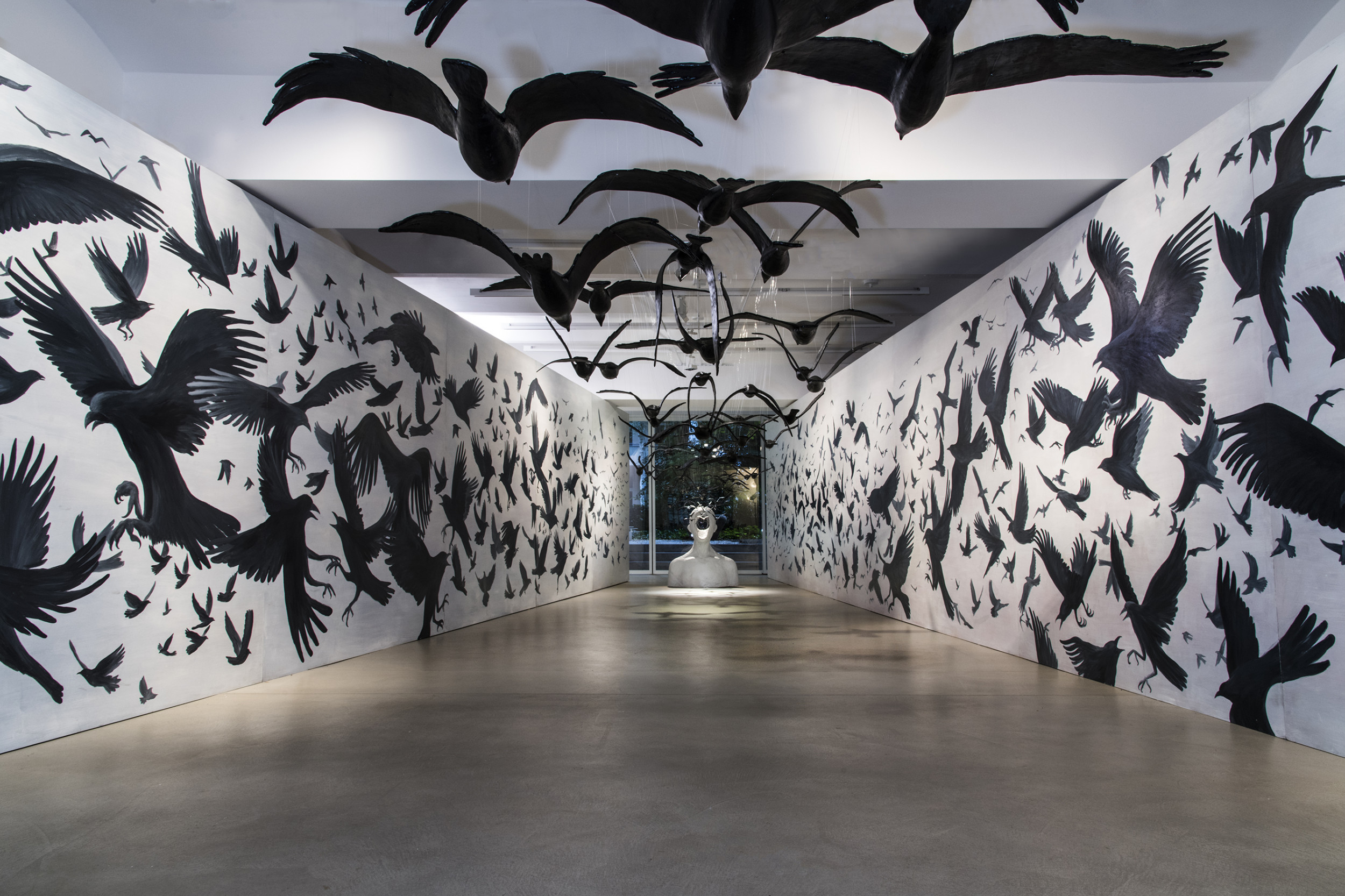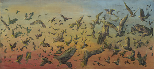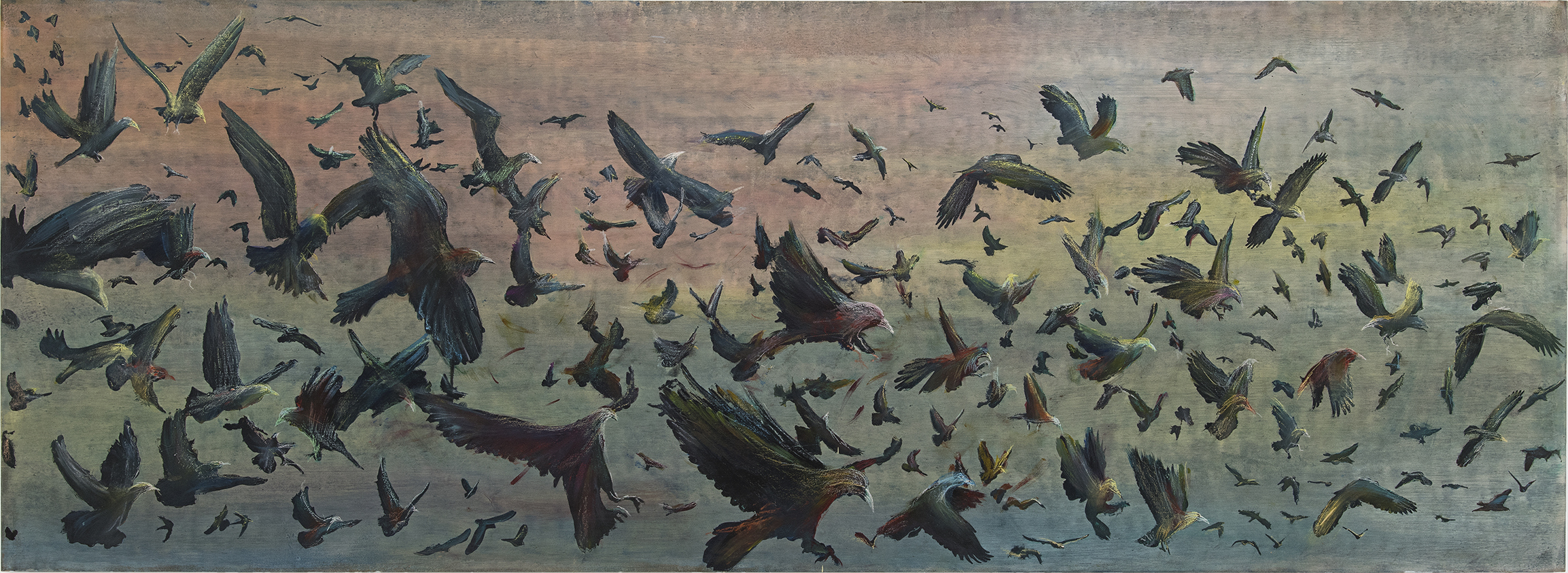 Hoards of black birds, eerie and haunting, roam in the seeming chaos yet are controlled by an invisible force, driving them like prey into the trap of the human head that swallows them. What are those birds – nightmares, soul-destroying doubts, erratic thoughts, suffering of love, bitterness of loss or hallucinations? Who is the person – an artist, a lunatic, a poet, a politician or anyone who walks on the planet Earth?